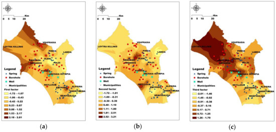 The first factor accounts for 28.54% of the total variance (Table 4) and underlines the relation between groundwater–temperature (Tw) and the presence of Li and B. In the literature, the presence of these elements, along with higher Tw values, have been deeply associated with deep water circulation through tectonic structures, and a longer residence time. The area where the maximum scores of the first factor occur, belongs to Stafylia graben, where deep fault zones are found [17,18,19]. The aforementioned relationship accounts for the increased (maximum) value of B measured in the same area, shown in Table 1. Additionally, a proportion of the initial statistical information of the first factor is accounted to Fe and Mn, which abound in the aquifers of Amaliada and Vouprasia because of the reductive environment (slightly acidic groundwater) of the area (Figure 3a) which is verified by the corresponding pH values of Amaliada and Vouprasia, shown in Table 3 [36]. This reductive environment is more obvious by the distribution of the scores of the third factor (Figure 3c). The second factor accounts for 22.16% of the total variance (Table 4) and relates the slightly elevated concentrations of Cr, U and As, to the redox conditions (Figure 3b). The third factor accounts for 16.63% of the total variance (Table 4) and more thoroughly displays the redox conditions of the area, depicting the relation between negative values of redox potential (Eh) and Mn in reductive groundwater environments (Figure 3c).