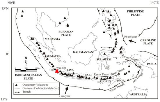 Indonesia is situated at the boundaries of three major plates on the southern margin of the Eurasian Plate, those are: the Eurasian, Indo-Australian and Pacific-Philippine Plates [15] (Figure 1). The Indo-Australian Plate moves northward, and is being subducted beneath the Eurasian Plate. The age of the subducted plate varies laterally. It is relatively young beneath Sumatra, i.e., around 40 Ma, where the subduction is highly oblique. In contrast, below Krakatoa, the age of the subducted plate is around 80 Ma, and it becomes significantly older, reaching up to 130 Ma in Eastern Java [16,17], where the convergence direction is almost perpendicular. The lateral variation of nature and age of the subducted plate influences the style of deformation and subducted angle along Sumatra to Java [18], which may produce a thinning in the subducted slab between Sumatra and Java [11], as mirrored by the abrupt change in the seismicity in the Sunda Strait [11]. The convergence rate increases from Sumatra to the East [19], i.e., about 6.7 to 7 cm/year [20,21]. The subduction zone is well defined by the volcanic arc, which stretches about 6000 km from Sumatra to the Molucca Sea, and by deep seismicity that extends down to a depth of 600 km [13,14,21,22,23].