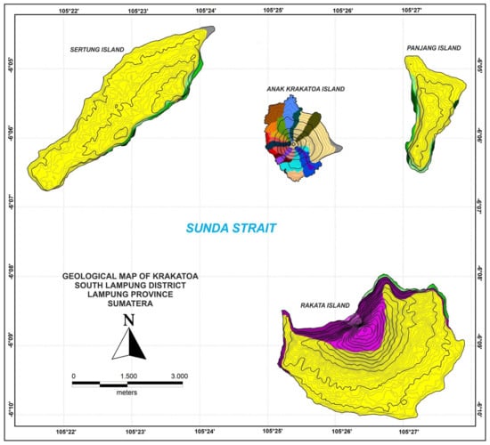 - Stehn, C.E. The geology and volcanism of the Krakatau group. In Guidebook for the 4th Pacific Science Congress; University of Michigan: Ann Arbor, MI, USA, 1929; pp. 1–55. [Google Scholar]