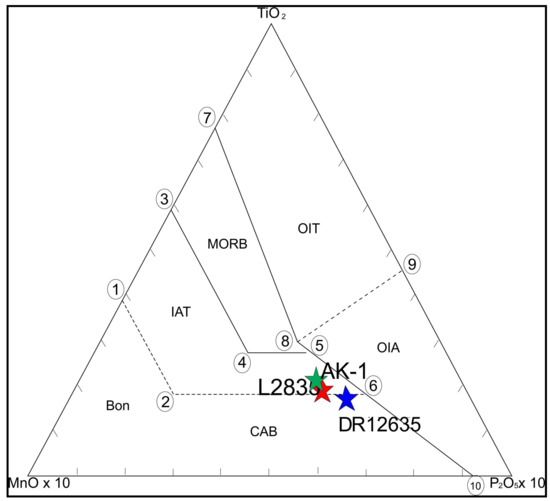 - Mullen, E.D. MnO/TiO2/P2O5: A minor element discriminant for basaltic rocks of oceanic environments and its implication for petrogenesis. Earth Planet. Sci. Lett. 1983, 62, 53–62. [Google Scholar] [CrossRef]