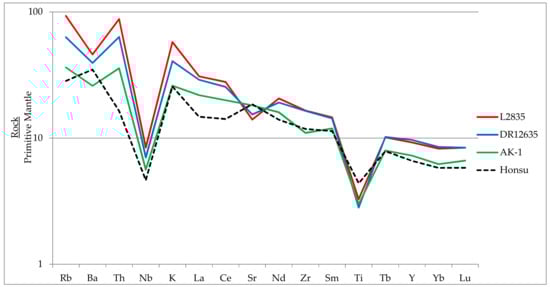 Normalized diagram to primitive mantle showing typical volcanic rocks from supra subduction zone. Data source: Primitive mantle [32], Honshu [33].