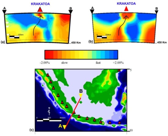 (a) Vertical section of P-wave model across Krakatoa Volcano. Tomogram is plotted as velocity perturbations relative to the ak135 velocity model [34]. The thin line in the cross section indicates the 410-km mantle discontinuity and the arrow depicts hot mantle upwelling. (b) Same as (a), but based on an S-wave model. (c) Index map, showing location of Krakatoa Volcano and A-B cross section line. Note the thinning in the subducted slab in the upper mantle below Krakatoa, which may be due to: (i) intrusion of hot mantle upwelling, (ii) strong slab pull in the study region [11,13], and (iii) the change from oblique subduction in Sumatra to frontal subduction in Java.