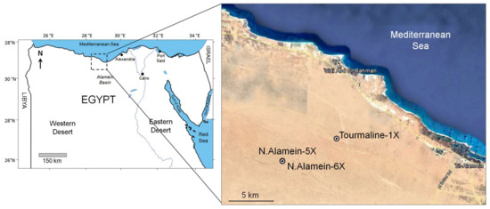 The Western Desert covers two-thirds of the whole area of Egypt. The coastal basins of Matruh, Shushan, Alamein and Natrun are located in the northern half of the Western Desert. The area of study covers the Alamein Field (Figure 1), located between latitudes 28°00′–30°00′ S and longitudes 28°00′–30°00′ E. The lithostratigraphic column in the northern part of the Western Desert comprises formation intervals from Pre-Cambrian basement rocks to recent deposits. The thickness of the sedimentary section is about 14,000 feet. Throughout the entire Mesozoic and a large part of the Cenozoic period, the northern Western Desert existed as a broad shelfal area at the southern margin of the neo-Tethys Ocean and experienced multiple transgression-regression cycles, which resulted in the formation of alternate carbonate and clastic deposits [22].