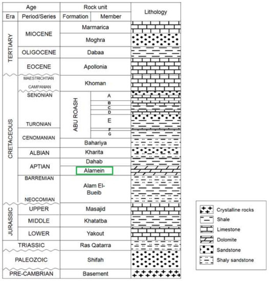 Hydrocarbons in the Western Desert are present in sediments of various stratigraphic periods, including the Paleozoic, Mesozoic (Jurassic and Cretaceous) and Tertiary (Eocene), with the most prolific oilfields mostly restricted to the Cretaceous sediments. According to Metwalli and Abd El-Hady [26], oil and gas pay zones in the Western Desert include, from top to base, Lower Miocene sandstone, Turonian carbonate rocks, Cenomanian carbonate rocks, Cenomanian clastic rocks, Aptian dolomite, Aptianclastic rocks and Middle Jurassic sandstone. The carbonate reservoirs of the Western Desert consist of dolomites and limestones from the Cretaceous age [27,28]. Sandstone reservoirs include the Jurassic Khatatba and Ras Qattara Formations from the Jurassic age, Alam El-Bueib and Kharita Formations of Lower Cretaceous age, Bahariya Formation and Abu Roash “C” and “E” members from the Upper Cretaceous age (Figure 2). Hydrocarbon production in the northern part of the Western Desert, which was used for the present study, is concentrated exclusively in the Aptian and the Cenomanian-Turonian carbonate-clastic reservoirs.