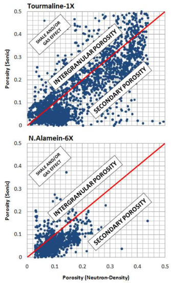 The neutron–density crossplot indicating that the porosity in the Alamein dolomite formation is strongly influenced by secondary porosity supports with previous findings made by Kassab et al. [34], whose petrographical study showed that the diagenesis-influenced porosity of the Cretaceous rock samples in the study area, which included the Alamein Formation, comprises not only interparticle, but also vugs and molds, in addition to fractures and channel porosities.