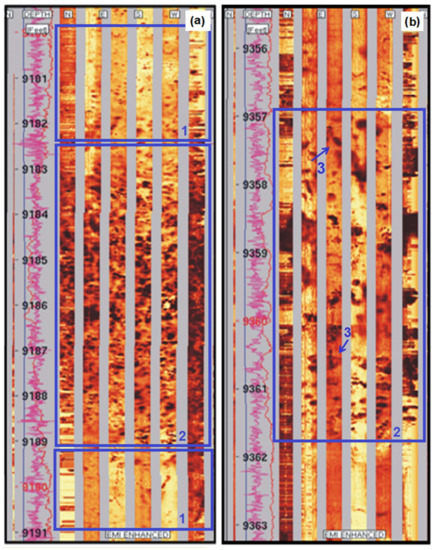 Overall, from the borehole image logs, we conclude that the dolomitic Alamein Formation in the evaluated interval contains abundant secondary porosity structures, including vugs, channels and fractures. Location of the zones with these structures (see Figure 7 and Figure 8) correlates with depths of the zones having higher secondary porosity values according to the interpretation of the well logging data (see Figure 3 and Figure 4). The interpreted secondary porosity from the FMS images in this study is in parallel agreement with the petrographic study by Kassab et al. [36], where Alamein Formation contains abundant vugs, molds, fractures and channel porosities.