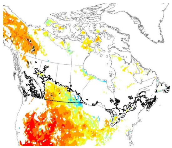 Soil moisture data from SMAP was acquired from the standard retrieval algorithms applied to the data by the mission teams. Several SMAP data sets using the Level 3 product, version 3 (subset 4.010) of the data were evaluated to determine if differences would impact the sensitivity to risks [28,29]. The 9 km Active-Passive soil moisture product (SMAP_AP) was evaluated for the 2015 period during which the active sensor was functioning (April 13, 2015 to July 7, 2015). The 36 km passive microwave derived soil moisture product (SMAP_P36) and the 9 km enhanced passive microwave data set (SMAP_P09) were also evaluated for the 2015–2016 seasons. Finally, the 9 km Level 4 soil moisture analysis update data sets (SMAP_AUP_surface, SMAP_AUP_rootzone) were evaluated at the surface and root zone for the 2015–2016 seasons. More details on the retrieval of soil moisture from the SMAP sensor can be obtained from the product documentation, but a brief summary is provided here. Soil moisture is derived from the SMAP passive sensor using L-band brightness temperature measurements and a single-channel retrieval algorithm at V-polarization. The retrieval model solves the tau-omega model using a constant incidence angle, solving for soil moisture as a single variable [30]. Ancillary data is used to account for variables that impact the brightness temperature other than the soil moisture. Vegetation optical depth is taken from a 13-year climatological database of the Normalized Difference Vegetation Index (NDVI) and is not specific to each crop type, and surface temperature is estimated using the NASA Global Land Data Assimilation Model. Results from the descending (morning) pass only were used since these represent higher quality retrievals due to greater uniformity in surface soil temperature and reduced impacts of Faraday rotation [31]. The Active-Passive soil moisture combines soil moisture retrieved using the passive sensor, with soil moisture retrieved using the active microwave sensor located on the SMAP platform [32]. As these retrievals have higher noise levels, the soil moisture is retrieved at a 3 km grid spacing and combined with the retrieved soil moisture from the passive sensor to create a downscaled 9 km soil moisture data set (SMAP_AP). Level 4 soil moisture data sets (SMAP_AUP_surface and SMAP_AUP_rootzone) were retrieved using a methodology described here [33]. In brief, the brightness temperature data from SMAP is assimilated into the NASA Catchment land surface model using an ensemble Kalman filter approach to update the model analysis with measured data from SMAP. The model assimilates data where retrievals are valid, but provides data over all grid cells where a valid land surface model value is retrieved, resulting in a temporally and spatially complete data set where retrieved values represent both soil moisture estimations impacted by data assimilation as well as modelled soil moisture only where and when soil moisture retrievals were not valid. Analysis updates were retrieved for this study for both the surface layer (top 5 cm) and the root zone (top 100 cm). The SMAP soil moisture retrieval algorithms include a Retrieval Quality Flag (RQF) that flags retrievals over surfaces with permanent ice and snow, urban areas, wetlands, and vegetated areas with vegetation water content greater than 5 kg/m2, as well as areas with close proximity to coastal areas and large water bodies. The result is limited to high quality retrievals over Canada (Figure 1), particularly in coastal regions and in proximity to the North American Great Lakes. Future improvements to SMAP retrieval correction for water bodies will greatly expand the area where analyses can be conducted. For the purposes of this study, results were only conducted over areas where SMAP retrievals were available.