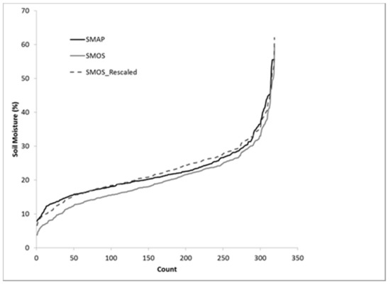 Cumulative distribution functions for soil moisture from SMOS and SMAP and SMOS rescaled to SMAP statistical distribution.