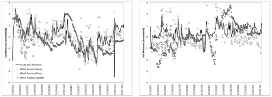 Overall, the SMAP passive soil moisture data sets (SMAP_P09 and SMAP_P36) showed the best correspondence, with correlation coefficients (R) averaging 0.5 over all sites and ranging as high as 0.8 for the Ontario site, and the lowest RMSE values (Table 4). These two data sets showed very similar trends at each site and there were no significant benefits in accuracy from using the spatially enhanced (SMAP_P09) data. The active-passive soil moisture data set (SMAP_AP) showed a somewhat weaker relationship with in situ soil moisture, with an average correlation of 0.3 over all sites, but ranging as high as 0.7 for some individual stations in the Alberta network. The SMAP_AUP soil moisture at the surface showed a similar relationship with in situ measurements as the SMAP_P09 and SMAP P36_data sets, but the relationship was much poorer at the Ontario site, where the estimates from SMAP_AUP_surface were much less responsive to the trends in late summer and fall (August, September and October) of both years evaluated (Figure 3). The relationship between all SMAP surface soil moisture data sets was poorest at the Manitoba site, where moisture trends were poorly estimated in April to July of 2015, and in particular in July and August of 2016. The difficulty in parameterizing SMOS and SMAP soil moisture retrieval models over this site has been discussed elsewhere and may be due to the high soil texture variability in this area [21,23,43]. Overall, there was a tendency of the satellite soil moisture to underestimate soil moisture during the driest conditions and overestimate it during wettest conditions, evident by the higher ‘peaks’ in both positive and negative soil moisture anomalies in Figure 3. For the SMAP_AP and SMAP_P09/P36 data sets, there was a greater underestimation of the magnitude of dry conditions, particularly for the sites in western Canada. Given the completeness and consistency of the passive microwave soil moisture, this data set was used in subsequent analysis. Since there was no significant difference between the soil moisture at the 36 km or 9 km grid for the passive soil moisture data set, the 9 km data set was used for further analyses.