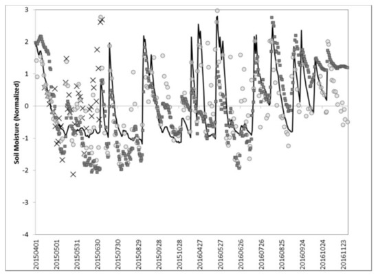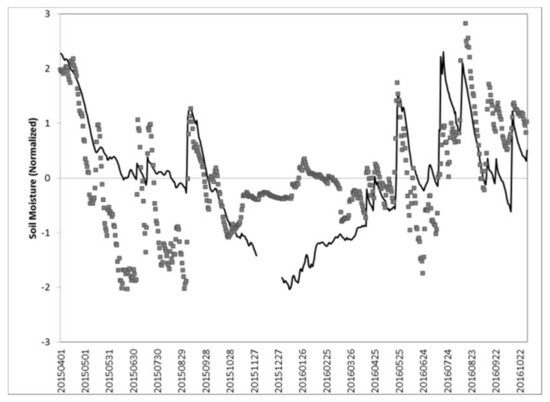 To use soil moisture to quantify risk conditions, an index that evaluates current soil moisture compared to a long-term average was calculated for each location and time step. The soil moisture difference from average (SMDA) was calculated as the current soil moisture difference from the multi-year average for each time step and location for the available data record (2010–2016):
