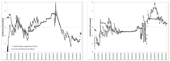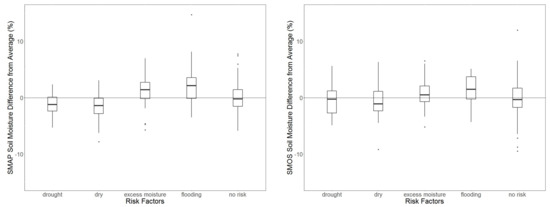 The blended SMAP-SMOS and the SMOS-only time series were used to calculate the SMDA under different risk categories (Figure 6). There was a large degree of variability in the SMDA for each risk category at the regional level. This may be in part due to the way that risks are analyzed, which assigns a general risk category at the regional level where the spatial extent of the risk conditions may be more localized. Overall, the risk conditions assessed from the SMAP-SMOS data set showed a general agreement with the CRPRC risk categories, with areas classified as drought or dry showing negative SMDA values and excess moisture and flooding showing positive SMDA values (Figure 6, left). In areas where no risk was assessed, the moisture values were close to zero, indicating they were exactly average over the long term and the variability was distributed equally in both directions. The blended SMAP-SMOS soil moisture time series showed a somewhat improved differentiation of wet and dry extremes compared to the SMOS-only soil moisture data set, with the average values more distinctly different from normal conditions in each case, the mid-quartile range more clearly above or below zero appropriate to each risk category, and a smaller overall interquartile range between the 25th and 75th quartiles. (Figure 6, right). This may be due to the differences between the soil moisture in each data set shown in Figure 5. Both data sets contained outliers that fell far outside the interquartile range, which may be related to the imprecise spatial delineation of risk using these qualitative reports, but could also be due to errors in both data sets in capturing relevant wetting and drying trends.