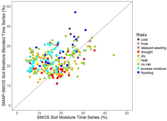 To gain an understanding of how the accuracy of the satellite data sets impact the use of the data for risk assessment, the soil moisture from the SMAP-SMOS and SMOS-only time series used to calculate the SMDA were compared to each other at the provincial scale and sorted by risk category (Figure 5). In general, the SMAP time series was wetter than the SMOS time series, particularly for areas that were identified as being subject to excess moisture. The range in moisture values between the SMAP-SMOS time series and the SMOS-only time series for areas where no risk was identified was high for both data sets, but somewhat higher in the SMOS-only data set (indicated by the larger horizontal spread in the data in Figure 5 than the vertical spread).