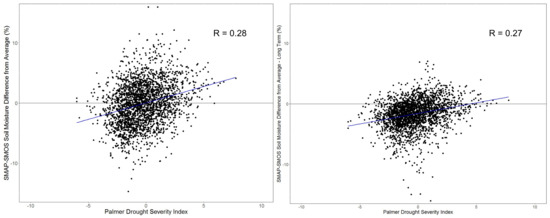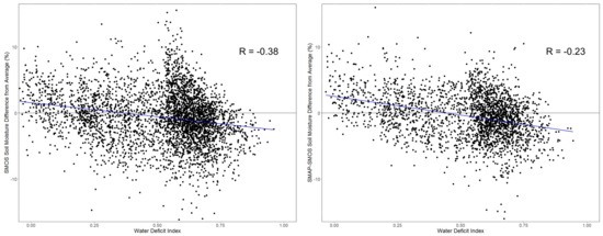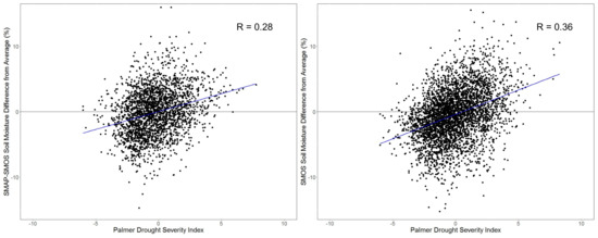 The SMAP-SMOS time series was compared to more spatially specific quantitative indicators of drought, the Palmer Drought Severity Index (PDSI), and the Crop Water Deficit Index (WDI). The SMAP-SMOS SMDA indicator showed a small but significant negative trend with WDI (R = −0.38), indicating that as crop water stress increases, the SMDA index decreased or showed drier than average conditions (Figure 7, left). There was a large amount of scatter in the observations, but in general areas where WDI was less than 0.25, indicating “no stress”, the SMDA indicated values above the long-term average. Conversely, areas with WDI above 0.75, indicating the most extreme stress, showed soil moisture values below the long-term average. Areas between these two categories showed greater variability, indicating that light to moderate stress is less clearly identified by the SMAP-SMOS SMDA index, with some instances being shown well below the long-term average, but other instances showing conditions above the long-term average. This may be related to the over/underestimation of soil moisture peaks and valleys seen in the soil moisture trend analysis against the in situ data, which would result in moisture values being over/under estimated right after wetting events, and drying more quickly and to a greater degree than the actual soil moisture. This may also be related to errors in the WDI itself, which relies on soil properties data in its calculation and plant water uptake models that may contain errors where parameters are estimated and not known precisely. The SMOS only data set (Figure 7, right) showed a somewhat weaker negative relationship with WDI (R = −0.23), with much greater scatter in the data, particularly at WDI values greater than 0.5 (or severe to extreme stress). The relationship between these two variables suggests that satellite soil moisture could be a good, but imprecise, surrogate for crop water deficits, and indicative of water related stress, with SMAP providing a somewhat more precise estimate than SMOS. The WDI has been found to be more strongly predictive of crop yields in other studies in Canada [41].