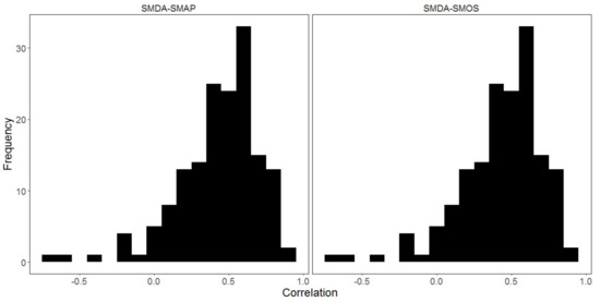 The SMAP-SMOS SMDA showed a weak but significant relationship with PDSI, with a positive correlation of 0.28 (Figure 8, top). The SMDA from the SMOS only data set showed a slightly stronger relationship with PDSI with R = 0.36 but with a similarly large scatter in the points. This weak relationship and the large scatter in the data suggests that the SMDA is not strongly indicative of longer term drought patterns characterized by PDSI. This is not surprising since satellite soil moisture data sets are observations of surface conditions and not water storage. The distribution of the site by site correlation coefficients for each climate station are given in Figure 8 (bottom), showing that most stations have a moderately high correlation with PDSI, but few have a strong correlation of greater than 0.75. The correlations for both the SMAP-SMOS blended data set and the SMOS only data set were similar (Figure 8).