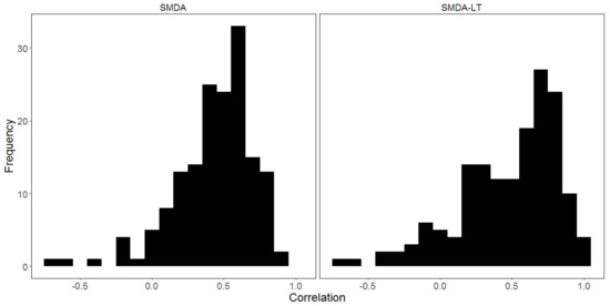 Histograms comparing site by site correlation coefficients for 346 climate stations between PDSI and SMDA (Left) and SMDA-LT (Right).
