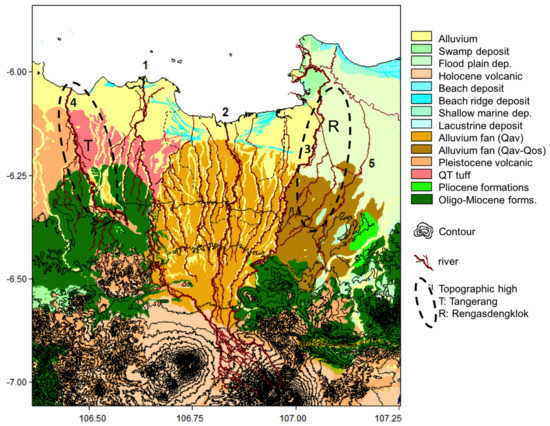 The Kali Bekasi River (3 in Figure 3) to the east of the city receives water intake mostly from the east, and further to the east the Citarum River (5 in Figure 3) flows from the south, turns to the east and circles back to the west, eventually flowing into the Kali Bekasi River and the Java Sea. This drainage pattern is indicative of a topographic high just east of the Kali Bekasi River, known as the Rengasdengklok High.