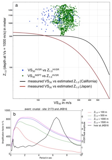 Regardless of which estimate of is used, Figure 5a shows that estimated for the Jakarta Basin are always much greater than the calculated from the Chiou & Youngs [8] empirical relations, either for California or Japan. Figure 5b shows amplification of PSA as a function of period for = 100 m/s, typical of the Jakarta Basin, and values of ranging from 100 to 1500 m. The amplification curve for = 100 m exhibits a pronounced peak at period 0.8 s, and this peak broadens and its period increases to 1.5 s and 2.0–2.5 s for = 500 and 1000 m, respectively, but changes little in amplitude or period range for = 1500 m. A typical HVSR curve for the Jakarta Basin, on the other hand, exhibits a pronounced peak at around 6 s (some curves such as this one also exhibit a secondary peak at shorter periods, see Cipta et al. [13]. While the HVSR curve does not necessarily represent the amplification of seismic waves, its peak period is widely regarded as coinciding with that of S-wave amplification Nakamura [37], it has been used to explain spatial patterns of earthquake damage Gosar [38], and it agrees with the fundamental period of S-wave resonant oscillation calculated form the Jakarta Basin velocity models of both Cipta et al. [13] and Saygin et al [39]. Thus, the basin parameters calculated for the Jakarta Basin model of Cipta et al. [13], appear to lie outside the range of values used for the development of the deep sediment corrections of CY2014, and the period dependence of CY2014 predictions for PSA using these corrections do not agree with the characteristics of ground motion implied by observed HVSR curves. Therefore, Therefore, we are skeptical that the deep sediment corrections of CY2014 will correctly account for seismic resonance in the Jakarta Basin.