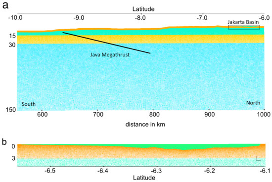 The seismic characteristics of the Jakarta Basin as obtained from the HVSR analysis will be represented in our 2D domain as a SN cross section over which the earthquake simulation takes place. To avoid extremely small elements, the sediment inside the basin is taken to be a homogeneous medium overlying bedrock, which is part of a 3-layer lithosphere, with maximum domain area as large as 445 km in length by 150 km in depth (Figure 6). The shear-wave velocity both in the sediment-filled basin and bedrock are taken as averages from the corresponding depths of the HVSR model. Crustal P-wave velocity () outside the basin is taken to be 1.8 times as indicated in Cipta et al. [13].