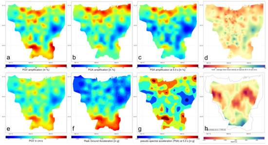 GMPE simulations have been performed for the three earthquake scenarios described above and results for the crustal earthquake scenario are displayed in Figure 7. Figure 7a–c show amplification of PGV, PGA and PSA(5 s) which vary between 200–500, 70–180 and 200–700%, respectively (note that we describe amplification following Pilz et al. [43], as described below in Section 6.2, where 0% corresponds to hard rock ground motion). The absolute values of these quantities are shown in Figure 7e–g, where it can be seen that PGV, PGA and PSA(5 s) have values of about 6 cm/s, 5% g and 0.6–0.8% g near the southern edge of the basin, about 60 km from the earthquake source. As distance from the earthquake increases in the center and northern part of the basin, the absolute level of ground motion (Figure 7e–f steadily decreases with increasing distance from the earthquakes. The amplification (Figure 7a–c), on the other hand, increases in the north of the basin, closely following the pattern of decrease indicated in Figure 7d.
