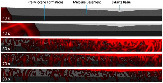 Snapshots of wave propagation, showing waves approaching (10 and 12 s, top two panels) and reverberating inside (50, 70 qnd 90 s, bottom three panels) the basin. The modeled 6.5 earthquake is taken to have ruptured a southward dipping, shallow crustal thrust fault 85 km south of the city center. The Jakarta Basin is the light gray colored area, overlying the dark grey medium, clearly shown in the top two pictures capturing snapshots at 10 and 12 s, respectively.