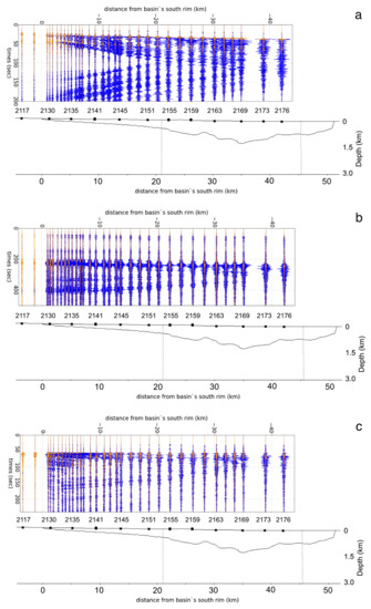 Bedrock seismograms (orange traces) are plotted over basin seismograms (blue traces) for (a) crustal, (b) megathrust and (c) intraslab events, respectively. Labelled points indicate location of stations corresponding to the seismograms plotted directly above the points. In the area between dotted lines (21–41 km from the basin’s rim) the basin structure is inferred from Cipta et al. [13], while the extension of the basin is estimated from geological data. The basinal area in this figure is the same as the basinal area in Figure 8.