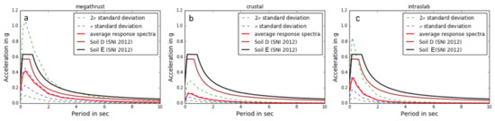 The current building code (2012 Indonesia’s National Standard–SNI 1726-2012) adopted the updated seismic map of Irsyam et al. [46] that estimated ground motions for a 2% probability of exceedance in 50 years (2500 years return period) as the maximum considered earthquake (MCE) level. Figure 11 shows that the current seismic building code in Indonesia that takes into account D and E soil classes performs well against the PSA estimated from GMPEs for the crustal earthquake scenario, but has significant probability of being exceeded (at the 2- level) for the megathrust and intraslab earthquakes. In this figure, the thick black and magenta curves represent designed ground motion produced by the MCE in a 2500 years return period for D- and E-type soils, respectively.
