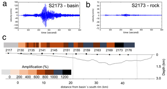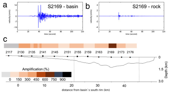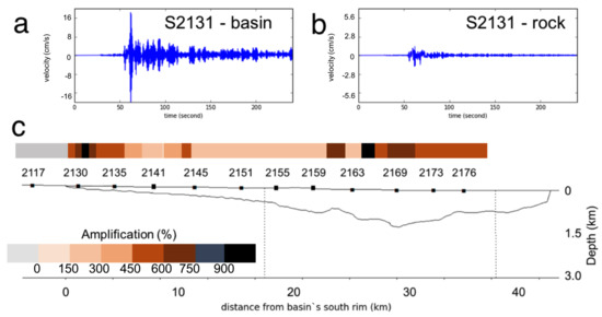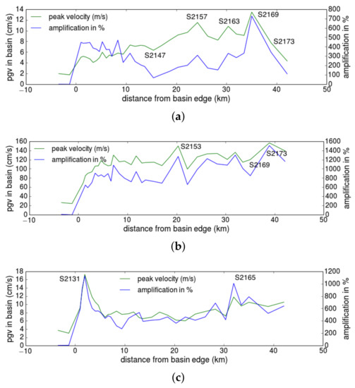 The Mw 6.5 crustal fault scenario generates a maximum peak ground velocity of 13.45 cm/s and the maximum PGV amplification is about 726%. Figure 12a shows that amplification is not uniform throughout the basin, while in S2147 basin depth gives small effect to peak velocity, in other stations basin geometry amplify peak velocity significantly. Most striking is the amplification observed at S2169 at the deepest part of the basin (Figure 12 and Figure 13a–c. Amplification here is describe in a manner similar to that used by Pilz et al. [43] in calculating estimated PGV amplification in Santiago Basin, Chile: we subtract the PGV values for the bedrock seismograms from the value for the basin seismograms, and divide this by the PGV value for the bedrock seismograms (multiplying by 100 to convert to percentage amplification).