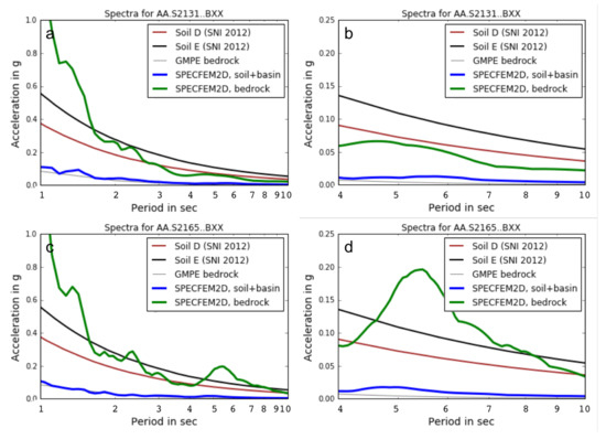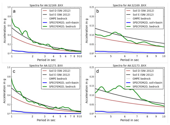 Since long period (>3 s) ground motions are much less sensitive to , Qp and Qs, it seems reasonable to consider how these compare to the design response spectra. At S2169, for all frequencies, mean ground motion predicted from GMPE fall below both the 2012-SNI Irsyam et al. [46] in Figure 11 and the 2002-SNI Puskim [50] (see also Sukamta & Alexander [51]) design response spectra (Figure 16a–d). On the other hand, ground motion predictions on soil inferred from the SPECFEM2D modeling are much higher than design response spectra of 2002-SNI (since 2012-SNI provides response spectra from PGA to PSA 4 s, we compare PSA 4–10 s with 2002- SNI). Figure 16a–d shows that ground motion on bedrock is lower than 2002-SNI and 2012-SNI, therefore we believe that basin depth and surface condition is of great importance for magnifying seismic motion, as shown in Figure 12b and Figure 14a–c amplification factor can reach 1200% for megathrust events. This amplification factor should be considered.