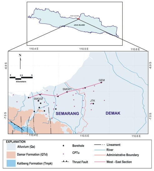 The study area is located between 6.8–7.0°S and 110.4–110.6°E, consisting of the coastal lowland morphology in the north and a hilly area in the south. The Semarang-Demak coastal plain in the north is overlain by surficial alluvium (Qa), and the south hilly topography consists of Quartenary volcanic rock (QTd) and Tertiary rock (Tmpk) (Figure 1). The Kalibeng Formation (Tmpk) consists of marl with tuffaceous sandstone and limestone intercalations. The Damar Formation (QTd) consists of tuffaceous sandstone, conglomerate, and volcanic breccia. The surficial alluvium lies unconformably on top of the Damar Formation. [38] stated that the coastal plain of Semarang—Demak is formed by an alluvial deposit of thick layers of calcareous and shell-bearing clay, with thin intercalations of sand, and occasionally gravel or cemented gravel deposited in a marine environment. Van Bemmelen (1941), in [38], estimated the thickness of the alluvial deposit to be 50 m near the south hills and along the coast of about 90 m. The latest tectonic activity in Semarang was in the Plio-Pleistocene, forming the thrust fault separating the Quartenary Damar Formation and the Tertiary rock (Tmpk) [39].