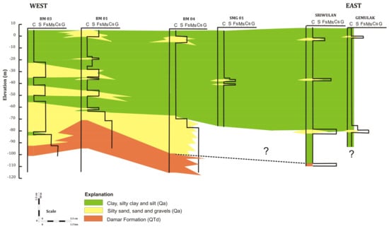 Hydrogeologically, the Semarang-Demak plain consists of unconfined and confined aquifers. The unconfined aquifer is formed by alluvial deposit of clayey sand to sand, with a fluctuating water table, depending on the recharge from precipitation. The annual rainfall of the Semarang-Demak plain is 1500–3000 mm, with dry months from May to October and wet months from November to April [45]. The confined aquifers are the Quaternary deposit aquifers and the Damar Formation aquifer [45]. The Quaternary deposit aquifers are divided into the Garang deltaic aquifer of freshwater and the Quaternary marine aquifer of saline water. The Garang deltaic aquifer consists of medium to coarse sand, and the Quaternary marine aquifers consists of clayey sand, and fine to coarse, shell-bearing sand. The Damar aquifer is the main aquifer in the Semarang - Demak plain that contains freshwater of volcanic rocks. The West-East section from compiled borehole and CPTu sounding data provides a typical subsurface profile of the study area (Figure 2).