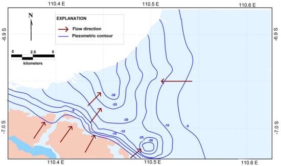 Figure 2 shows that the bulk of the Semarang-Demak plain sediment consists of thick aquitard layers of clay and silty clay, intercalated with lenses of sand and gravels. The thickness of the clay layer is 25–80 m, and becomes thicker towards the east (Demak). From the grain size distribution in Figure 2, it can be seen that the Garang deltaic aquifer exists at the depth of 60–90 m, and the Quaternary marine aquifer occurs at the shallower depths (less than 60 m). The Garang deltaic aquifer and Quaternary marine aquifer were possibly formed during regression and transgression during the Holocene. A specific study on the Semarang-Demak plain Quaternary deposition is not yet available; therefore, the detailed information on its depositional history is largely unknown. The Quaternary aquifers mostly exist as lenses which contain freshwater and saline water of limited yield; therefore, utilization of these aquifers is limited. The most exploited groundwater comes from the Damar Formation, and the piezometric contour of this aquifer shows some depressions related to groundwater utilization at industrial estates (Figure 3). The lowering of piezometric pressure due to groundwater exploitation exerts additional pressure on the overlying aquitard. The compaction of the thick, compressible upper clay of the study area is thought to contribute to the land subsidence.
