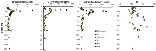Concentrations of Na+ and Cl− ions, electrical conductivity and pH of the porewater and groundwater from wells are shown in Figure 8. The chloride concentration in the upper 10 m is less than 500 ppm, and increases to 1100–6300 ppm at the depths of 10–35 m. Chloride concentration at the depths of 40–180 m is well below 400 ppm. The pH of the waters ranges from 6.7 to 8.4. The variation of Na+ion concentration and electrical conductivity with depth is similar to that of the chloride concentration. It is revealed that saline water exists at the depth of 10–35 m, and most likely the saline water was formed during the sediment deposition. Figure 8 indicates that the Quaternary marine aquifer system occurs at depth of 10–35 m, and the freshwater below this depth comes from either the Garang deltaic aquifer or the Damar Formation aquifer. From this result, we use the term saline clay for clay with saline porewater (chloride concentration of more than 1000 ppm), and freshwater clay for clay with fresh porewater.