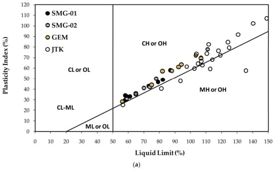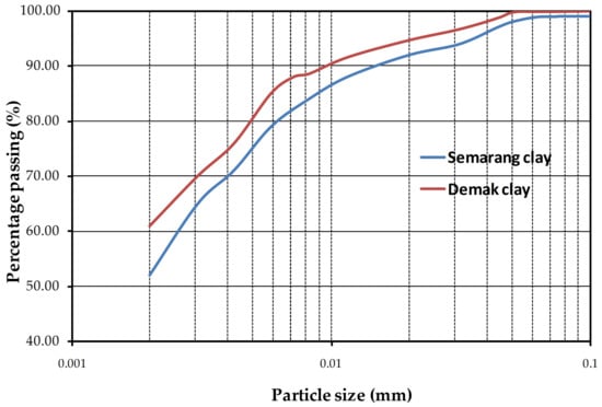 The laboratory results are presented in Figure 4, Figure 5 and Figure 6. Figure 4 shows that the natural water content of the clay ranges between 41.6 to 87.5%, bulk density between 12.7 to 18.3 kN/m3 and specific gravity from 2.45 to 2.90. Degree of saturation, calculated from the preceding results, varies from 90.0 to 124.0%, showing the saturation state of the clay. The grain size distribution curves of Semarang-Demak clays are quite similar, showing a high clay content (particle size less than 0.002 mm) of more than 50% (Figure 5). Atterberg limit test results show that the Semarang-Demak clay is mostly highly plastic (CH) (Figure 6a). Semarang clay has medium to high activity and Demak clay has high to very high activity (Figure 6b). The higher the activity of clay, the more pronounced the influence of the clay fraction on its engineering behavior and the more susceptible it is to changes in pore fluid composition [51]. The high activity of clay is also related to greater smectite presence [28].