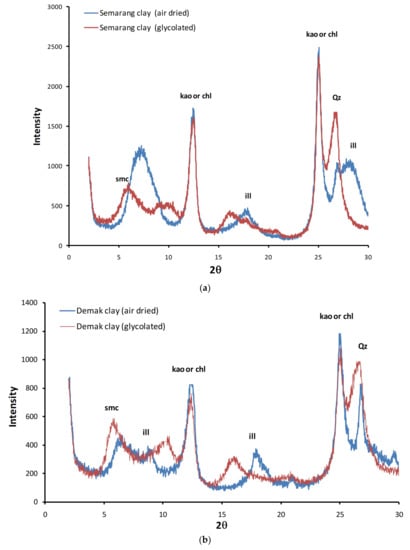 XRD diffractograms: (a) Semarang clay; (b) Demak clay.