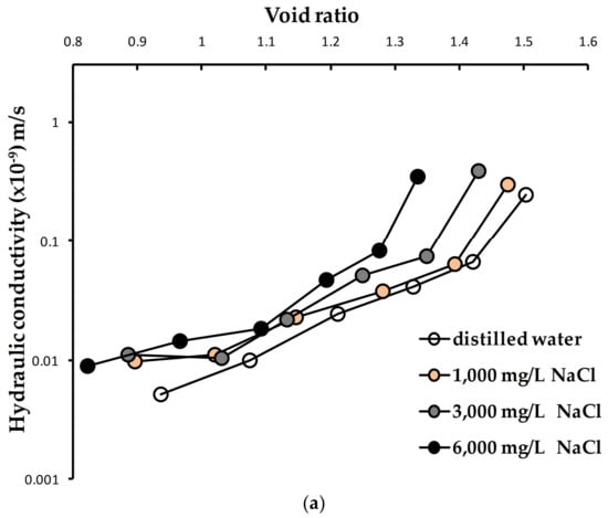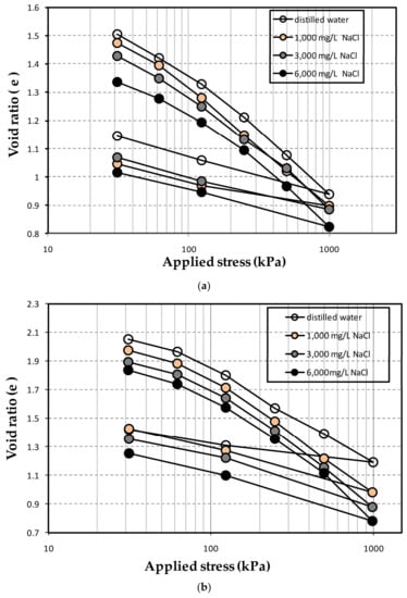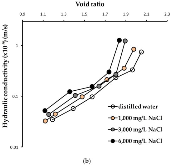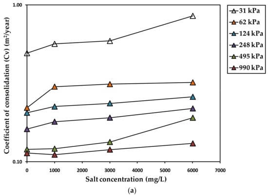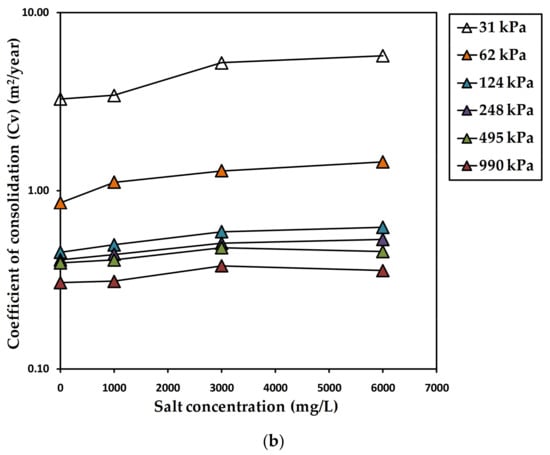 The average compression index (cc) for the Semarang-Demak clay (Table 2) shows a slight decreasing trend as the salt concentration increases. The decrease in the compression index is attributed to the reduction of the double-layer thickness as the pore fluid concentration increases. Swelling of the clay sample occurs during the unloading process, as indicated by the swelling index (cs). The physicochemical condition of the porewater affects the swelling behavior in terms of osmosis [53]. The intake of water that is held by the clay during unloading is the result of the osmotic gradient between the more concentrated pore fluid within the clay matrix and the less concentrated ambient porewater. The effect of salt concentration on swelling is more evident in saline water. The osmotic pressure difference for the saline water decreases as the concentration increases, and thus causes less swelling of the saline clay. The computed coefficient of consolidation (cv) and hydraulic conductivity (k) for various porewater salinities are shown in Figure 10 and Figure 11.