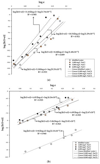 Table 3 shows that the increase of salt concentration raises the average cv values from 17.0–42.0%, and the k values from 7.0–37.5%. The higher the salt concentration, the higher the hydraulic conductivity, which causes the compression rate (cv) to increase. Mathematically, a linear relationship exists between the logarithm of hydraulic conductivity (k) and the void ratio (e) for clays [54]; this is shown in Figure 12 for the Semarang-Demak clay. This relationship is useful to predict the change in hydraulic conductivity of the clay over increasing stress states (i.e., void ratio) at various groundwater salinity values. A higher change in hydraulic conductivity due to higher groundwater salinity is observed in Demak clay (Figure 12b), indicating higher activity of the clay.