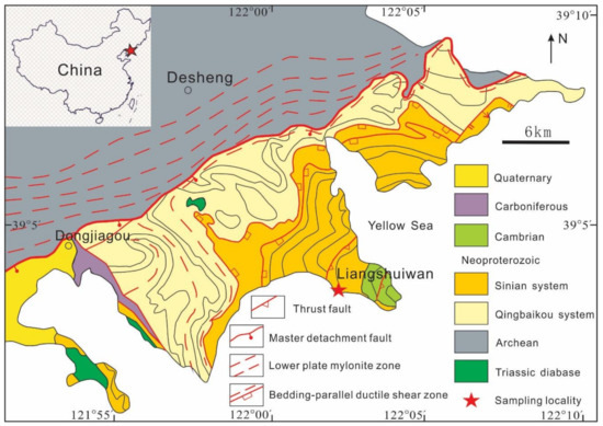 The Neoproterozoic Sinian System, from which the samples were taken, consists of a thick sequence of shallow marine sediment, i.e., sandstones, shales, limestones, or dolomitic limestones with stromatolitic layers (Figure 2). The Neoproterozoic section is unconformably overlain by a Cambrian-Carboniferous marine section, and the region was deformed in the Triassic by the amalgamation of the Yangtze and North China plates at ca. 220 Ma [50]. The Archean footwall gneisses of the Liaonan metamorphic core complex (trend: N 45° E) include a mylonite in fault contact with Cretaceous and older rocks; the mylonite includes folds (trend: N 45° E, vergence is ~N 45° W) and a lineation (N 45° W; upper plate translation to the NW) that are not consistent with a deformational correlation between the Cretaceous core complex formation and the N–S trending folds 20 km south hosted in the Sinian System in our study [49,51]. Calcite strain studies in the Liaonan core complex hanging wall Cretaceous limestones and veins preserve a shortening strain parallel to the axis of the core complex [52].