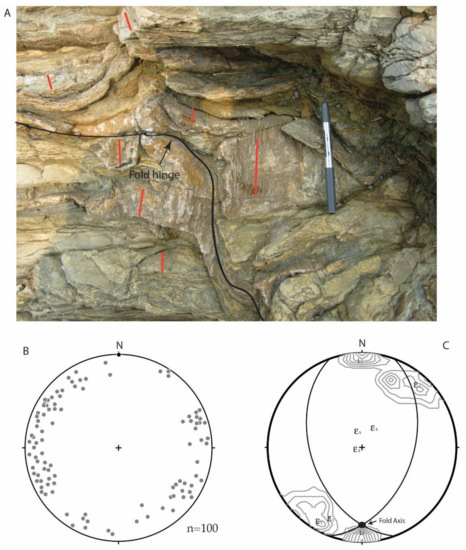 - Spang, J.H.; Groshong, R.H., Jr. Deformation mechanisms and strain history of a minor fold from the Appalachian Valley and Ridge Province. Tectonophysics 1981, 72, 323–342. [Google Scholar] [CrossRef]