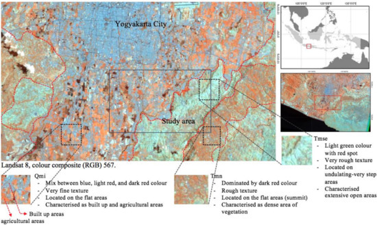 According to the result of visual interpretation using Landsat 8, the research area can be divided into four lithological units including Young Merapi Volcano deposits (Qmi), Alluvium (Qa), Nglanggran Formation (Tmn), and Semilir Formation (Tmse). All lithological units have distinctive colour, relief, and texture. The Qmi consists of undifferentiated tuff, ash, breccia, agglomerate and, lava. This lithology is widely distributed in the fluvial-volcanic plain of Merapi volcano, south part of Merapi Volcano, including the study area. Qmi is characterised as an extensive flat area which has high soil fertility due to the volcanic activity. Additionally, Qmi is also characterised as a dense soil which has abundant of groundwater. Therefore, Qmi is often utilised as residential areas or agricultural areas. Based on Landsat 8 imagery, the Qmi is characterised by blue, light red, and dark red colour (