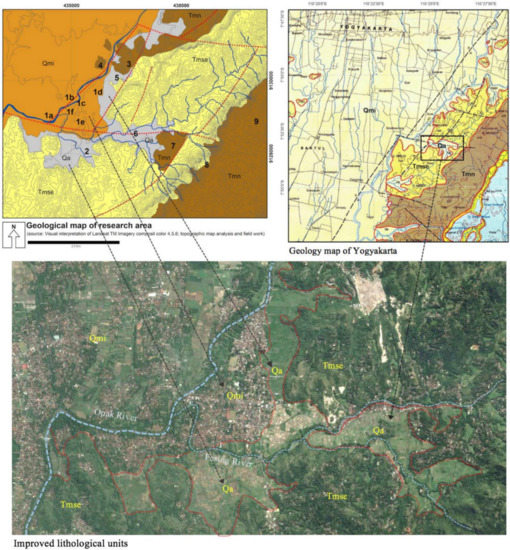 Figure 10), the middle part of study site is the border area between three main lithological units and formations: First, the young volcanic deposits of Merapi Volcano (Qmi); second, The Semilir Formation (Tmse); and third, The Nglanggran Formation (Tmn). These boundaries of the lithological unit and geological formations show the semi-linear or linear feature that can be indicated as a geological lineament (