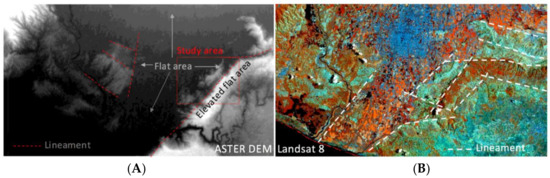 Figure 12A), there is a distinct difference of flat area in the west part and the elevated flat area in the east part of the study area. The flat areas are expressed with the black colour and have very fine texture, while the elevated flat areas are expressed with the white colour with the rough texture on the left and right side areas. From the south (Parangtritis beach) to the north (Berbah Village, near the Yogyakarta International Airport), this lineament has approximately 35 km of total length with NE-SW orientation and continues to Prambanan, Gantiwarno, Wedi Villages in Klaten Regency with E-W orientation. The lineament in this area is closely related to the Dengkeng Fault (E–W orientation) which is located 8 km north part of the study area. The complete lineament of the study area and their orientation is presented in