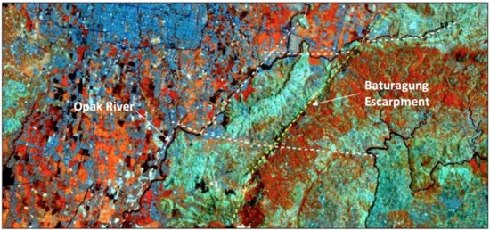 Based on the Landsat 8 imagery, there are some linear or semi-linear features in the study area. Opak, Oya, and Pesing Rivers have some linear features indicating the geological lineament. The Opak River flows from the north to the south and shows the NE-SW lineament. This river is often associated with the famous Opak Fault in Yogyakarta City. The other lineaments were found in Pesing and Oya Rivers. They have the same orientation (West–East) of lineament. These lineaments are closely related to strike-slip faults (W–E) which trims The Opak Fault in the north and middle of the study area. This phenomenon explains why the Opak River turns westward in some locations (