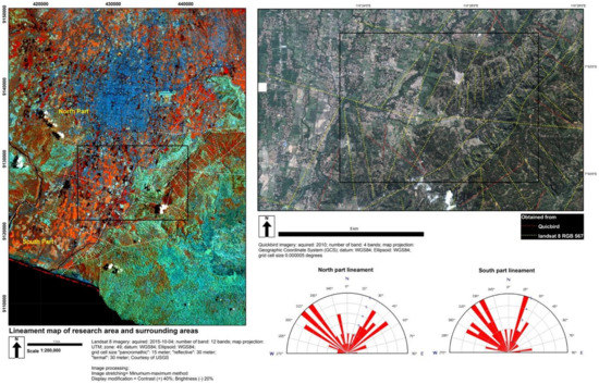 44]. This fact signifies that the south part of the study area has more micro faults than the north part. For example, the outcrop 17 segment 3, this outcrop has the much micro fault and joint. Also, the structure of the rock in the outcrop 17 segment 3 is very brittle. Therefore, based on the analysis, this area is very vulnerable when the earthquake occurs. The surface tremor due to the earthquake will cause extensive damage in the area that has a lot of joint and fault. The fault reconstruction based on the lineament and outcrop study can be seen in