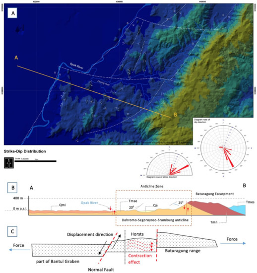 Figure 15B,C). As a result, the lithologies in the eastern part of Opak fault is obliged to fold and forms the folded hills. Additionally, this area consists of Semilir Formation which has relatively soft volcanic deposits. The anticline landform of the folded hill, and the map of the distribution of strike and dip of the outcrops in the study area can be seen in