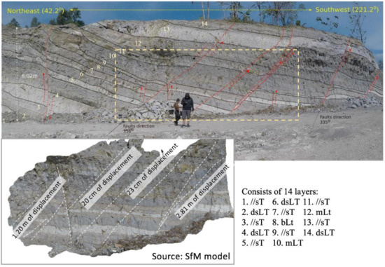 Based on the field observation and the structure from motion (SfM) results, there are loads of evidence of fault which were recorded on the outcrop. At least 31 faults were found in the study area. Most of them are located in the outcrop type 1 and 2 which belongs to the Semilir Formation. Most of them spread between the main normal fault (Opak Fault) and the main strike-slip fault (Bawuran Fault and Punthuk-Cinomati Fault) or in the centre of the study area. The biggest fault displacement is located in the outcrop 17 segment 3 in Srumbung Village. The fault was seen in the field with the direction of 147°–327° or Southeast and Northwest direction. The layer displacement was about 2.31 m with the south part moves upward and north part moves downward (