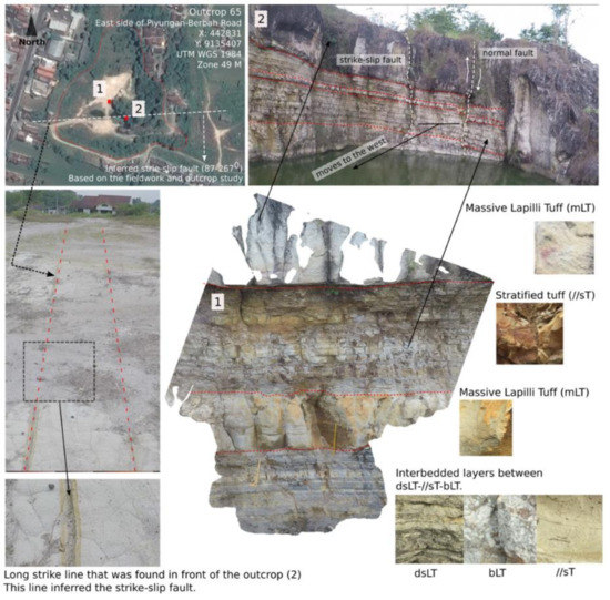 Figure 16). The type 1 usually consists of two distinc layers: the lower and upper layers. The lower layer consists of interbedded layers between diffuse stratified Lapilli-Tuff (dsLT), thin-bedded Lapilli-Tuff (bLT), and massive Lapilli-Tiff (mLT). Meanwhile, the upper layer consists of the interbedded layer of stratified Tuff (sT), parallel stratified Tuff (//sT), and cross-stratified Tuff (xsT). The type 2 is similar to the type 1 which consists of the interbedded layer of dsLT, bLT, mLT and sT. However, the outcrops type 2 has a complicated layer configuration and has various thin layers. Additionally, based on the structure from motion analysis (SfM) the fault evidence was mainly found on outcrops type 2 in the middle part of the study area. The outcrops type 3 is entirely different from the outcrops type 1 and 2. The outcrops type 3 consists of volcanic breccia, lava flow containing breccia, agglomerate rock, and tuff. This type of outcrop is characterised as massive and compact outcrops with the bigger fragment of breccia. The outcrops type 3 has the different colour from the other outcrops. This outcrop has a darker colour (black or dark brown) comparing to the outcrop 1 and 2 (see