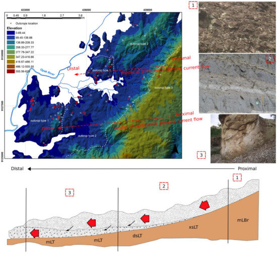 42]. This pattern is characterised by a decrease of clastic lithic size from the proximal area (mlBr) to the distal area (mLT) in the east part of the study area. This lithofacies probably was formed because of the significant decrease of the pyroclastic current during the quasi-steady flow. The middle-west part of the study area is a transitional area from relatively thin to stratified lithofacies such as sT, dsLT and bLT on steep proximal slopes to thicker deposits of mLT. Such down current occurred when the flow transformation from turbulent current to laminar current [
