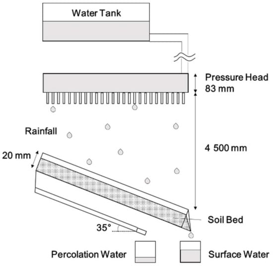 The annual rate of soil water erosion was investigated using artificial rainfall tests. Figure 1 shows a schematic diagram of the artificial rainfall tests. The simulated soils with pH ranging from 2.0 to 10.0 were placed in the case (240 mm × 155 mm, thickness = 20 mm) at the same rate of filling. Artificial precipitation (pH = 6.2) was then supplied to the simulated soils for 1 h to accelerate soil water erosion. The measured pH of rainwater at the post-mining site showed pH = 5.6–6.0. The experimental conditions were set by reference to a past study []. The rainfall intensity was adjusted to 80 mm/hour using the hydraulic head, the water content of the simulated soils was 15%, the slope angle was 35 deg., and the annual rainfall was 3000 mm/year [,,,]; these annual rainfall and rainfall intensity values reflect those observed in Indonesia. The rainwater was collected as surface and percolation water during the artificial rainfall test. After drying the surface water at 105 °C in an oven, the weight of the residue was measured and used to calculate the amount of soil water erosion per hour E. Based on E (g/hour), the annual rainfall R (mm/year), the section area A (cm2), the dry density of the simulated soil G (g/cm3), and the rainfall intensity I (mm/hour), the annual rate of soil water erosion H (cm/year) was calculated as
