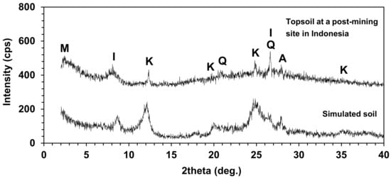 X-ray diffraction (XRD) patterns of topsoil in the coal mine in Indonesia and simulated topsoil: M, I, K, Q, and A represent Montmorillonite, Illite, Kaolinite, Quartz, and Albite, respectively.