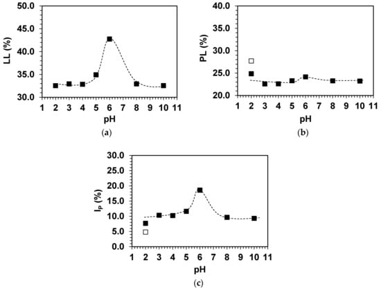 Change of LL, PL, IP at different pH values ranging from 2.0 to 10.0: (a) change of LL; (b) PL; (c) IP. At pH 2.0, the value indicated by white dots was calculated based on the average value, and that indicated by black dots was based on ideal value, according to the changing trends of PL and IP.